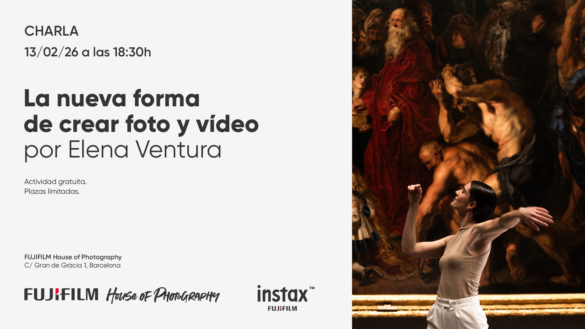 13 febrero, 2026 (18:30 - 19:00)AgendaCharla "La nueva forma de crear foto y vídeo" por Elena Ventura en House of PhotographyEn un momento donde el contenido en vídeo y el formato vertical son protagonistas, la instax mini EVO Cinema™ nace para responder a esa nueva forma de consumir y crear imágenes.