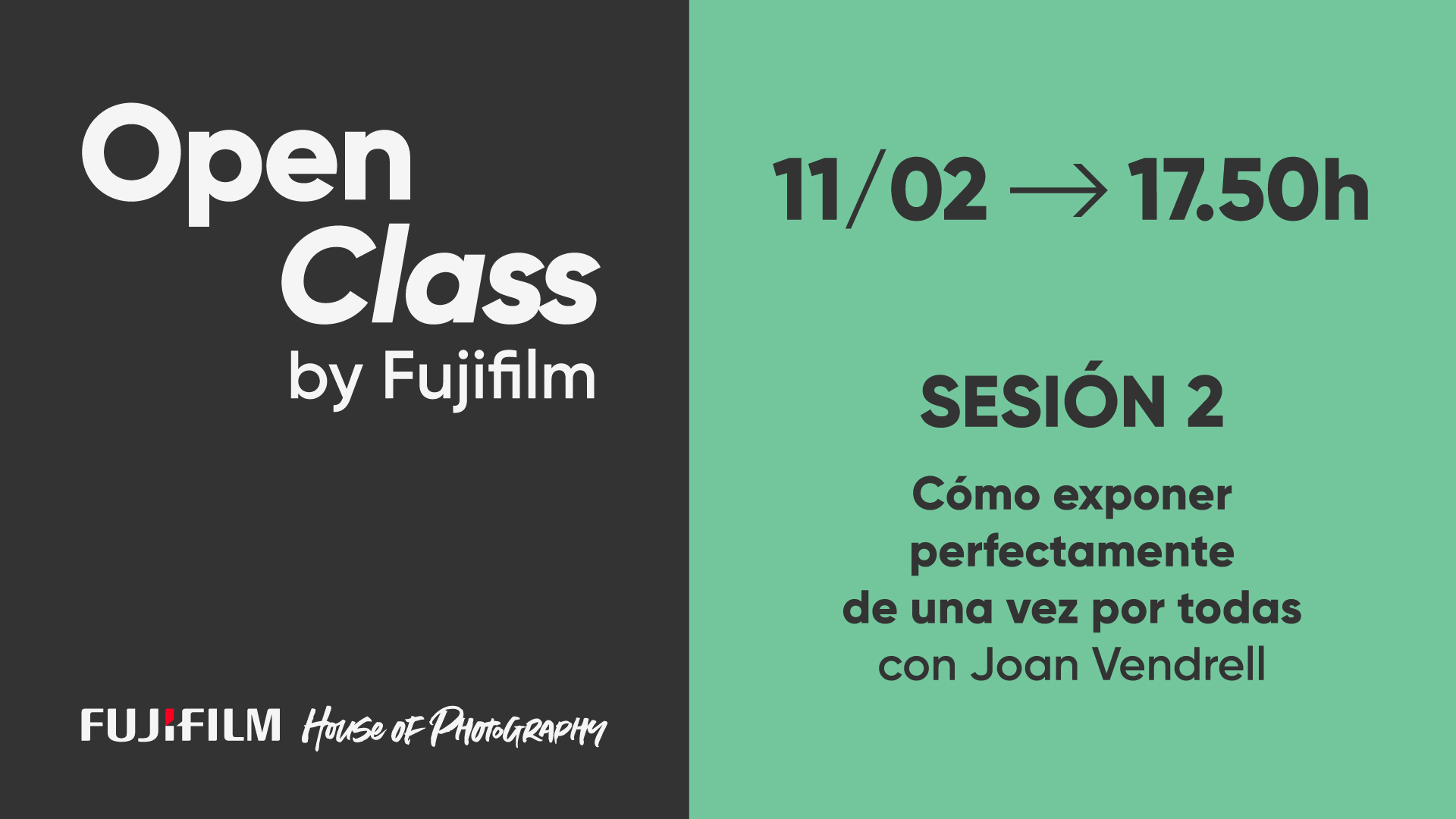11 febrero, 2026 (17:50 - 18:50)AgendaOpen Class by Fujifilm con Joan Vendrell - Sesión 2: "Cómo exponer perfectamente de una vez por todas"Un ciclo de cursos presenciales pensados para quienes quieren ir más allá de la técnica básica y empezar a tomar decisiones creativas con criterio, confianza y una visión propia, de la mano de uno de los fotógrafos formadores más reconocidos.